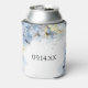 Mantenha suas latas frias com as bonito flores de Hydrangea, água, café. Personalize-o com os nomes da noiva e do noivo e data para criar um favoritos para festas gentil para o tema de inspiração do verão ou da festa de jardim festas de noivado, cerimônias de chá de panela ou casamento e recepção. Este elegante casamento florescido personalizado pode ser mais fixe mostra uma fotografia floral pintada de cor d'água digitalmente, de flores de hydrangea azuis com fundo branco.