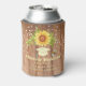 Um elegante girassol amarelo rústico Graduação pode e refrigerador de garrafas compreendendo um fundo de madeira marrom decorado com um girassol amarelo de cor branca bonito, com uma abelha e luzes de cordas. Faz um dom/guarda exclusivo dos parabéns para um formando. Personalizado com o nome do formando, ano e universidade para fazer disso um presente único de parabéns de graduação