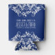 Modelo personalizável de refrigerador de bebidas individuais elegante. Lace floral branco com texto personalizável. Fundo personalizado azul. Se precisar de ajuda para personalizar qualquer um dos meus designs, entre em contato com o designer do ArtOnWear. Formatação de texto livre com ajuda ao vivo disponível por solicitação.