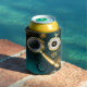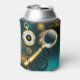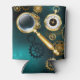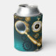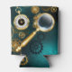 Uma lupa antiga com alça de ouro e lente convexa sobre fundo verde com engrenagens douradas e um relógio antigo. Estilo Steampunk.