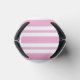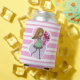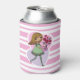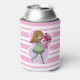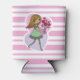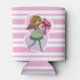 Lindo e fofo can cooler listrado de rosa e branco com uma menina caprichosa de longos cabelos amarelos e vestindo um vestido verde e meias listradas. Ela está segurando um lindo buquê de rosas vermelhas em seus braços estendidos. O fundo é feito de um coração de amor rosa e roxo.