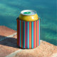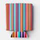 Este resfriador tem um simples design de faixas verticais de espessuras variadas em vermelho, laranja, roxo, preto, azul claro e branco.