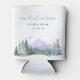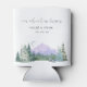 Bem-vindos convidados ao seu casamento em estilo com os refrigeradores de cerveja "Nossa Aventura Começa". O design apresenta um cenário de montanhas azul-aquarela e verde e texto de script.