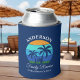 Reunião Familiar Summer Beach Palm Trees Sun Retro Style Marinho Blue Can Cooler. Excelente para férias de reagrupamento familiar de acampar na praia a um cruzeiro de barco. Personalize com seu nome de família, local, ano ou data e muito mais.