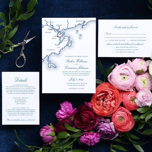 Dê aos seus convidados de North Shore um na moda com o nosso marinho azul... o mapa do Salem... Com um Salem detalhado, a design do mapa do MÃE, esses coozies adicionam um toque de encanto costeiro à sua celebração. Ideal para casamentos no Salem Waterfront Hotel & Suites, Hotel Hawthorne, Hamilton Hall, Old Town Hall e Peabody Essex Museum. Personalize-os com seus nomes ou data para um toque pessoal. Seus hóspedes vão adorar esses favores práticos e memoráveis. Trabalho de arte por Designs de Mapa Costeiro.