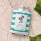 Comemore o seu casamento no estilo moderno tropical com este favor de casamento, que inclui um par de silhuetas de palmeiras em preto, com os nomes dos casais, a data do casamento e a localização por baixo. Um aqua de turquesa de praia e fundo listrado branco acrescentam talento costeiro de verão.