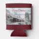 Uma lata mais fria com uma fotografia de uma paisagem de inverno gelada com pinheiros cobertos de neve. Um trem vermelho, dourado e preto à moda antiga, viajando pela natureza selvagem.