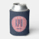 Estampa de jeans azul escuro e moldura circular xadrez vermelha e branca clássica vintage cobre este cooler de latas moderno com iniciais finas elegantes e nome moderno em azul escuro. Altere facilmente o nome e as iniciais usando o modelo fornecido. Cabe latas padrão de 12oz. Tecido durável e fácil de limpar durará por anos e manterá sua bebida gelada. Material de espuma colapsável facilita o armazenamento. Veja "Sobre" para mais informações.