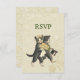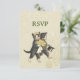 Cartão RSVP de casamento divertido. O doce gato de noiva vintage segura um buquê de casamento de rosa branca e o gato do Groom fica ao seu lado com seu chapéu preto. Fundo floral de marfim. Personalizar texto de data no verso. A versão tem o número de participantes...Adultos e texto Crianças.
