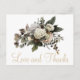 Buquê de flores brancas de inverno com folhagem verde escura de caçador sazonal amor e agradecimento agradecimento personalizado cartão postal de casamento. +++++++++ Personalize com seus nomes e texto! ++++++++++ Adequado para casamentos temáticos elegantes e sofisticados de outono ou inverno.