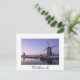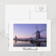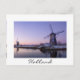 Cartão-postal das moinhos de vento de Kinderdijk ao longo do canal durante um nascer de sol roxo no inverno, na Holanda, com uma fronteira branca, e o texto: "Holanda".