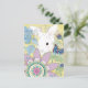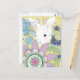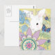 Um coelho de coelho branco doce esconde entre flores estilizados e folhas neste cartão alegre e colorido.