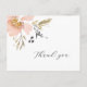 O nosso cartão de agradecimento floral clássico inclui caligrafia gratuita e fluida, flores rosa pálido, folhas verde-escuras e caqui com ramos num fundo branco. O verso está em branco para que possa escrever a sua própria mensagem com nomes na parte inferior. Perfeito para casamentos, chá de noiva e chá de bebé. Para alterar ou remover a cor do fundo ou o texto no verso, clique no botão 'Personalizar'.