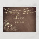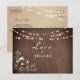 Envie uma apreciação sincera com este cartão postal de agradecimento de casamento rústico. Com uma textura de madeira falsa quente, luzes de corda brilhantes e detalhes florais dourados, é uma maneira encantadora e elegante de agradecer aos seus convidados após o seu dia especial.