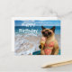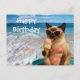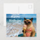 Celebre um aniversário perfeito com este cartão postal com tema de praia, apresentando um gato siamês fabuloso que absorve o sol em uma roupa glamorosa e óculos de sol. Com ondas do oceano e vibrações de festa, este cartão postal é ideal para amantes de gatos que amam a vida na praia. Envie desejos de aniversário tão legais, fofos e praianos quanto eles!