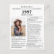 Deseje feliz aniversário com este cartão de aniversário único no estilo jornal, incluindo uma foto do destinatário e uma coleção de fatos divertidos e notícias mundiais de 1997. Seja criativo e crie um souvenir personalizado. Projetado para se assemelhar a um jornal vintage em estilo clássico preto e branco. Uma maneira fofa e divertida de celebrar os anos noventa!