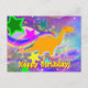 Cartão de Aniversário Feliz do Dinossauro a Cores Bonitas, Estrelas e Suavancas Feliz. Um dinossauro de desenho animado de cor laranja giro, com estrelas a cores e rodopias postais, com texto personalizado "Feliz Aniversário!". Este cartão-postal colorido é totalmente personalizável, mude o texto "Parabéns!" e adicione seus textos e imagens! Um cartão postal de parabéns para enviar aos grandes e pequenos fãs de dinossauros!