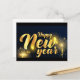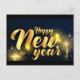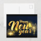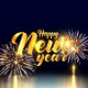 Texto dourado de Ano Novo Feliz com fogos de artifício e fundo azul escuro, celebração festiva, design de cartão postal, tipografia elegante, para a temporada de férias.