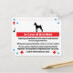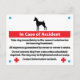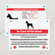 Cartão totalmente personalizável para se conectar à caixa do seu cão ou ao seu arnês no carro, caso haja um acidente e você não consiga lidar com seus cachorros! Substitua a silhueta preta de cachorro por uma foto do seu próprio cachorro ou até adicione seu nome/logotipo de canil. Adicione as suas informações personalizadas às costas. Use os círculos azuis como guias de perfuração e use clipes ou gravatas zip para se conectar a uma caixa. Para maior durabilidade, laminado. Também disponível em forma genérica de massa.