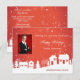 Modelo de cartão postal com a sua própria foto emoldurada por um design divertido em vermelho e branco com casas e árvores de Natal. Perfeito para um corretor de imóveis agradecendo seus clientes e desejando uma Feliz Época de Natal. Se desejar, pode usar um fundo de texto branco para a área do endereço no verso (ver personalização adicional).