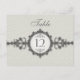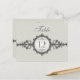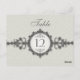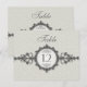 Um cartão de mesa que recebe sua influência da era Art Déco. Uma faixa ornamentada, que se assemelha a um relógio de pulso vitoriano, apresenta uma medalha que contém o número ou letra da mesa com a palavra personalizável "mesa" acima dela. O fundo bege imprime um padrão sutil como uma marca d'água. Design de dupla face para conveniência de qualquer ângulo. Disponível em cores alternativas com produtos correspondentes.