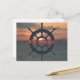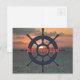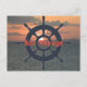 Cartão poste com pôr do sol tropical e roda do navio.