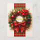 Cartão de exaustão de Natal para Xadrez Elegante Envie um toque de elegância de feriado com este cartão-postal de Natal festivo, com uma bela coroa adornada com ornamentos vermelhos, pinecones de ouro e verde-azul exuberante. Um arco clássico de fita de xadrez e a mensagem "Feliz Natal" adicionam um encanto de eterno, fazer este postal perfeito para espalhar alegria aos amigos e à família perto ou longe. Com a frente mostrando um design de feriado tradicional, o verso oferece um espaço para vazio para sua mensagem pessoal. Ideal para aqueles que amam o decoro clássico de feriado e apreciam uma maneira rápida e ponderada de se conectar durante a estação festiva. Perfeito para enviar ou anexar presentes como uma nota sazonal!