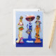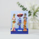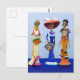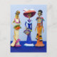 Cartão postal de três catrinas coloridas sobre um fundo azul.