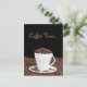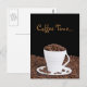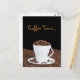 Este cartão do tempo do café caracteriza os feijões de café recentemente roasted que cercam e que enchem um copo de café branco que senta-se em uns pires brancos. Um fundo preto fornece o lugar perfeito para as palavras do "tempo café…". Este texto é personalizado facilmente usando o modelo fornecido. Este cartão seria grande enviar a um amigo ou usar-se para anunciar seu cafetaria ou café.