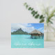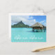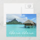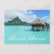 Cartão com um recurso luxuoso do bungalow do overwater na lagoa azul clara da ilha do Pacífico de Bora Bora, perto de Tahiti em Polinésia francesa com o texto: "Bora Bora, Polinésia francesa".