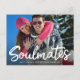 Anúncio de cartão-postal da data do seu casamento. Use sua imagem horizontal completa com "Almas Gêmeas" sobreposta à sua foto. Um gradiente preto aparece ao longo da parte inferior do cartão para fazer com que o texto se destaque. Se você não precisar do gradiente, basta eliminá-lo. Personalize seus nomes e data na frente e no verso. Ou use o gradiente branco se ele ficar melhor.