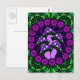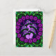 Um cartão com os cinco cogumelos roxos contra um fundo do preto, o azul escuro e o roxo do redemoinho. O design é circular, e tem uns motivos florais roxos mais claros cercar os cogumelos. Atrás do design roxo são os motivos verdes ornamentado.