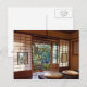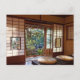 Este cartão mostra a vista da casa de chá no jardim de Tamatsukuri Chorakuen, um hotel dos termas do tradicional-estilo em termas de Matsue, Japão. A parte externa da árvore de cereja está a ponto de estourar na flor.