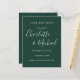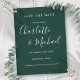 Com nomes de estilo de assinatura, este elegante esmeraldo verde salve o cartão de data pode ser personalizado com suas informações especiais em caracteres brancos. Projetado por Thisnotme©