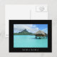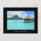 Cartão-postal com uma estância de bungalow superd'água de luxo na clara lagoa azul da ilha pacífica de Bora Bora, perto do Taiti, na Polinésia Francesa, com uma fronteira negra, e o texto: "Bora Bora".