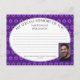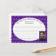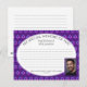 Estrela moderna de David Compartilha um Cartão com fotos de Memória, incluindo um verso PERSONALIZÁVEL de Foto e Escritura Cristã. Usado em vez de um Livro de Condolências, os convidados podem anotar sua memória especial da pessoa que passou. O design mostra o painel oval com MINHA MEMÓRIA ESPECIAL DE VOCÊ em texto curvo, que é PERSONALIZÁVEL, para que você possa adicionar seu próprio título. Você também pode adicionar uma foto e o nome do amado na frente. As linhas pontilhadas estão lá para ajudar as pessoas quando escrevendo, e continuam no verso. A design mostra uma estrela colorida do padrão de David contra um fundo robusto de PURPLE. Estes cartões podem ser entregues em funerais aos participantes, ou incluídos em convites e devolvidos por aqueles que não podem estar presentes mas que ainda gostariam de partilhar uma memória. Convites correspondentes disponíveis. Também vem em outros designs de Designs Bereanos.