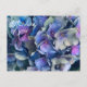 Cartão postal de flores de hortênsia azul para usar em qualquer ocasião. O texto de exemplo na frente é "Pensando em você" com sentimento continuado no verso que diz "e enviando uma oração". O restante do cartão está em branco para uma nota manuscrita. A fotografia de uma hortênsia azul em botão é a imagem na frente com texto no canto superior. O verso também tem uma imagem de fundo desta flor. Use para "melhoras", "feliz aniversário" ou uma simples mensagem para dizer olá a um amigo.