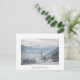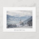 Cartão da igreja de St. Pankraz em uma paisagem alpina na neve cercada por nuvens e por névoa em um monte com uma vista sobre o vale de Zillertal com as montanhas dos cumes no fundo em Fügen, Áustria no inverno com uma beira branca e o texto: "Zillertal".