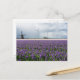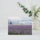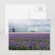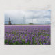 Cartão postal de uma paisagem com moinho de vento tradicional e várias moinhos de vento modernos para gerar energia verde atrás de um campo com flor de hífen roxa na região de Bulb, na Holanda.