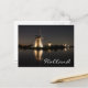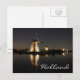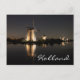 Cartão postal de uma paisagem com várias moinhos de vento, iluminados à noite, com reflexo na água do canal tranquilo em Kinderdijk, Países Baixos, com o texto: "Holanda".