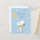 Envie gratidão sincera aos seus convidados e presentes com este lindo cartão de agradecimento do Peanuts Snoopy e Woodstock. A frente apresenta a ilustração emocionante de Snoopy abraçando Woodstock sob uma lua crescente brilhante e estrelas cintilantes, tudo contra um fundo azul claro calmante com uma escrita que diz "Obrigado". O verso do cartão é totalmente personalizado e inclui uma mensagem especial sobre o nascimento do bebê e os nomes dos pais, proporcionando uma maneira encantadora, nostálgica e personalizada de expressar sua gratidão após o chá de bebê neutro ou para menino.