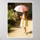 Uma jovem moça em um sundress amarelo claro no jardim numa tarde ensolarada com um guarda-chuva rosa da mesma cor que os rosas que ela contempla. Imagem impressionista muito doce.