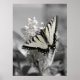 Borboleta de cauda alternada numa flor em preto e branco com uma tonalidade de cor amarela
