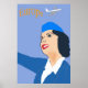 Poster de viagens de ar retrô com uma aeromoça olhando para o céu