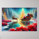 Santa getting ready to go and fill the night with Christmas cheer. A pond surrounded by poinsettias make the scene even more beautiful.