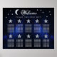 Um quadro de 10 mesas para um tema de casamento celestial, com a lua e a estrela num fundo azul-noturno estrelado. Os números das mesas estão escritos em grandes estrelas de cinza. A lua, as estrelas e a palavra Bem-vindo (escrita em um roteiro caligráfico elegante) são cinzas de prata, o resto do texto é branco. A foto noturna estrelada é de Felix Mittermeier, de Pixabay, e está livre para uso comercial.