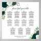 Este assento floral chic impressionante facilitará para seus convidados encontrar suas mesas na sua recepção de casamento. A design mostra rosas de aquarela pintadas à mão lindamente em lindas matizes verdes esmeraldas, enfeitadas por pinturas de folhas de jardim e folhagem. O intrincado título de caligrafia acrescenta um toque extra de sofisticação. Com espaço amplo para acomodar até 110 nomes em 11 mesas, cada 10 assentos, o gráfico também inclui os nomes do casal e a data do casamento no fundo.