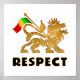 Leão de Judah, Respeite! Imagem: Leão Dourado de Judah segurando bandeira vermelha, ouro verde e etíope. Texto: Palavra negada, "RESPEITO". Esta imagem mostra o Leão de Judah, símbolo do Movimento Rastafariano e está associada ao gênero musical Reggae, cultura Reggae e Jamaica.