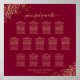 Este elegante quadro de assentos de casamento apresenta um fundo cor de burgundy, marrom ou vinho tinto, juntamente com embelezamentos de ouro de filigres de folha falsa ou fraldas. O design é sofisticado, mas simples, e apresenta um título requintado de caligrafia de script. O gráfico acomoda até 130 nomes, espalhados por 13 mesas com 10 lugares por mesa. Além disso, há espaço no fundo para os nomes da noiva e do noivo, junto com a data do casamento. É uma forma fantástica de adicionar um toque de estilo e sofisticação à sua recepção de casamento, enquanto ajuda os seus convidados a localizar os seus assentos.
