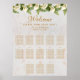 A tabela de assentos de casamento tem 13 mesas. Na borda superior, há lírios brancos e névoa. O fundo é mármore branco. Os nomes da noiva e do noivo são escritos num guião caligráfico elegante. Todo texto tem uma cor de ouro. Os lírios brancos e a samambaia são de um cartão de saudação vintage de Bertha Maguire (1862-1910), agora no dominio público.
